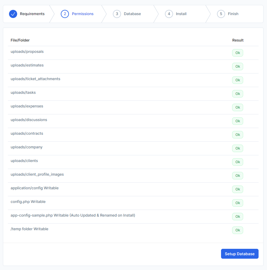 If all permissions are passed click Setup Database otherwise you need to set 755 permissions for folders and 644 for files.